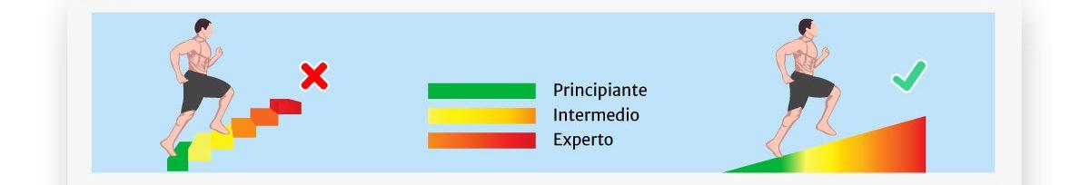 Una persona no pasa de ser principiante a intermedia en un momento determinado en el que deja de tener unas necesidades a otras. Es un proceso progresivo que no solo tiene en cuenta el tiempo que lleva entrenando, sino también:
