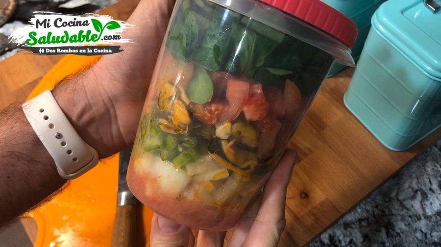 Incluso podemos tener en la nevera varios tuppers verticales o tarros de cristal con las ensaladas ya hechas para uno o dos días siguientes, la clave es prepararlos en este orden:
