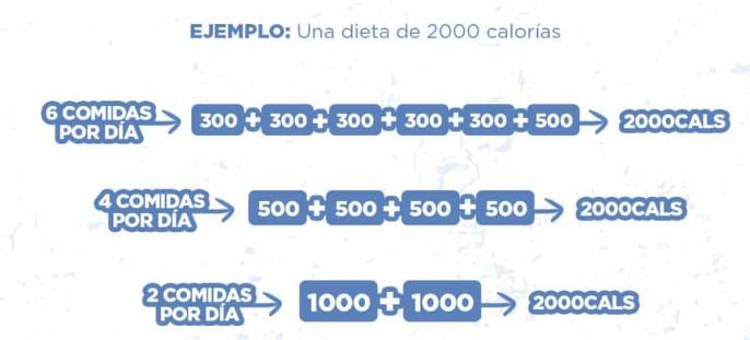 Y como puedes ver en la imagen a continuación es más fácil y práctico distribuir la misma cantidad de calorías en un mayor número de comidas: