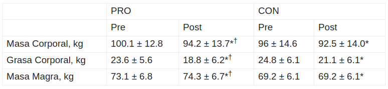 Como prueba de ello tenemos el estudio realizado por The American Journal of Clinic Nutrition: ESTUDIO Dividieron a sujetos no entrenados, en dos grupos. Ambos grupos realizaron la misma actividad física 6 días por semana con un elevado déficit calórico del 40%. Pero un grupo consumía 1,2 gr/kg de proteínas al día (CON) mientas que el otro grupo consumió 2,4 gr/kg al día (PRO). Los que consumían más proteínas tuvieron un aumento de masa magra y una mayor perdida de grasa. Mientras que el otro grupo mantuvo la masa muscular invariada y perdieron menos grasa. Aún así, la pérdida de peso total en ambos grupos fue la misma , como se puede observar en la gráfica a continuación: