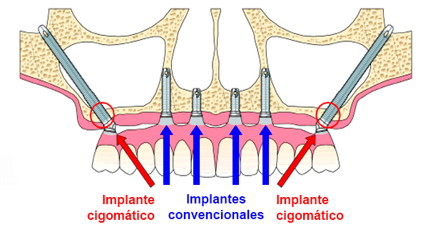 Son implantes que se anclan sobre el hueso cigomático (de allí su nombre). El hueso cigomático se encuentra en los pómulos y es muy resistente, por eso la dentadura permanece bien sujeta y firme con el paso de los años. Es la mejor elección para personas que lleven tiempo sin dientes o que hayan pasado por una fuerte enfermedad periodental.