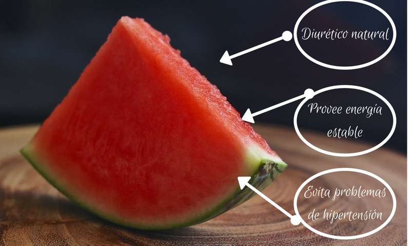 4. Sandía: Al igual que el melón, la sandía es 90% agua. Además es refrescante, dulce y fácil de conseguir. Si no te gusta consumirla en rodajas siempre la puedes licuar y añadir a tus mezclas de zumo favoritas o como agua del día. Añade un poco de menta o chía en tu receta y notarás la diferencia.