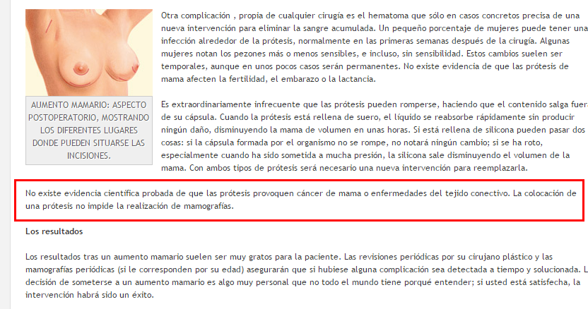 La realidad es que no existe ninguna evidencia médica que relacione la aparición de cáncer de mama y el uso de prótesis. Ningún estudio ha podido aportar una muestra real. Pero no lo digo yo, os remito a las fuentes directas y especialistas en este tipo de temas.