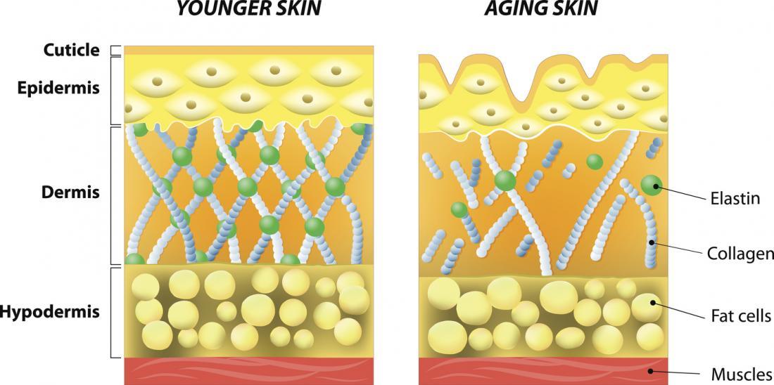 El envejecimiento por sí solo o envejecimiento natural con el paso de los años , además de los factores externos. Las personas producimos aproximadamente un 1 por ciento menos de colágeno en la piel cada año a partir de los 20 años. Como resultado, la piel, los cartílagos, tendones, órganos y músculos se vuelven más frágiles y débiles con la edad.