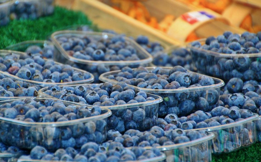 o delante de una bandejita llena de color, repleta de fruta con su aspecto turgente y globoso que invita a "intoxicarnos" la vida con azul...