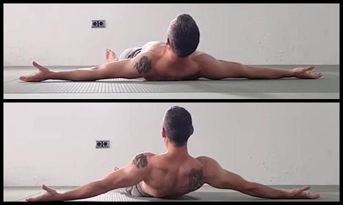 Nos pondremos acostados boca arriba y presiona con los dorsos de la mano. Aquí estaremos trabajando los hombros posteriores y la espalda indirectamente.