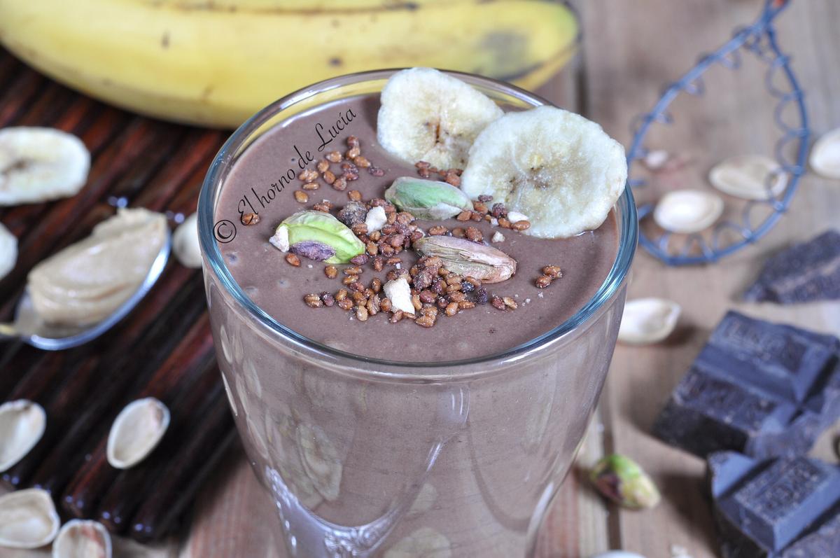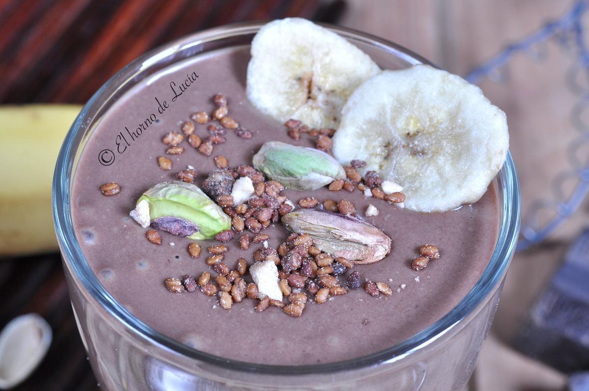 • Para decorar por encima yo he puesto: unos pistachos, semillas de sésamo caramelizado con panela, chocolate y plátano, y unas rodajitas de plátano frito.