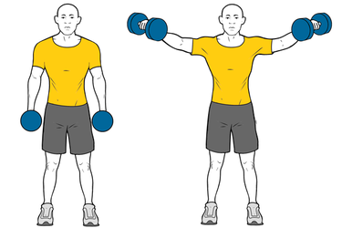 Elevación de hombros: debes colocarte de pie y erguido, con una pesa en cada mano, elevar los brazos lateralmente hasta dejarlos a la altura del hombro.