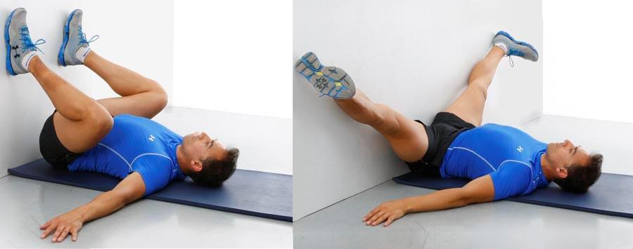 Aductores: estírate en el suelo y apoya las piernas en la pared, deberás abrirlas lentamente pero sin doblar las rodillas, posteriormente, recuperar la posición inicial doblando las rodillas hacia el pecho.