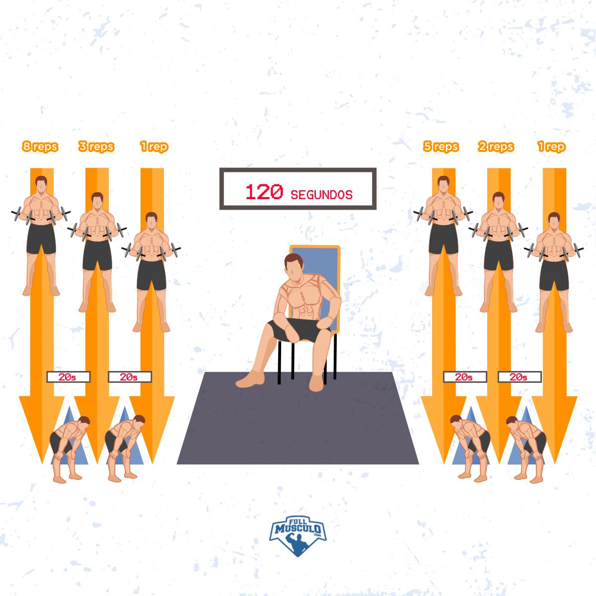 El descanso pausa consiste en realizar 3 series seguidas con un descanso mínimo entre ellas.