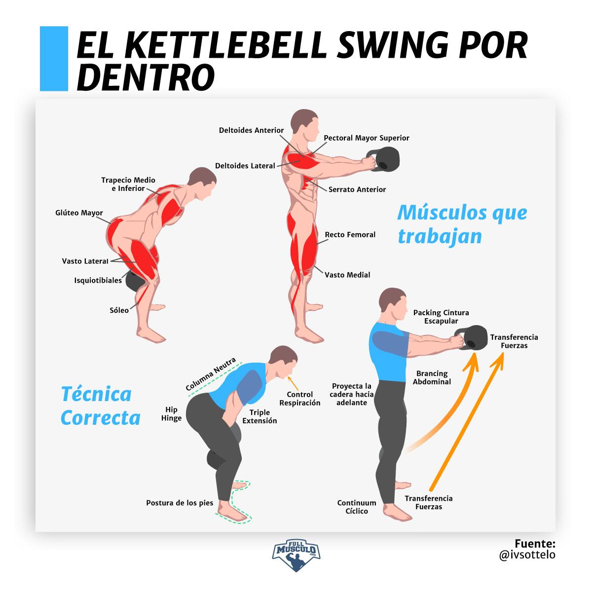 Esta es generada desde la cadera (incluyendo el Core) hacia las extremidades (brazos y kettlebell), con una alta implicación muscular de la cadena posterior.