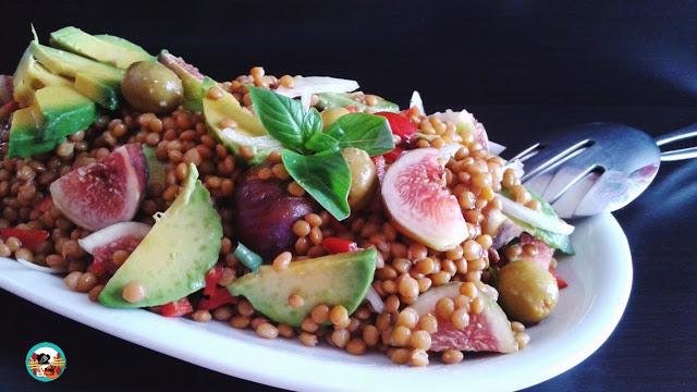 En el blog Huele Bien podemos encontrar otra receta de ensalada que nos funciona perfectamente como entrante e incluso para plato único ya que está muy completo, nos aporta vitaminas, fibras, hidratos y grasas saludables, la encuentro original ya que entre sus ingredientes podemos encontrar frutas tan nutritivas como el aguacate y el higo. Puedes ver al detalle su elaboración haciendo clic a continuación: