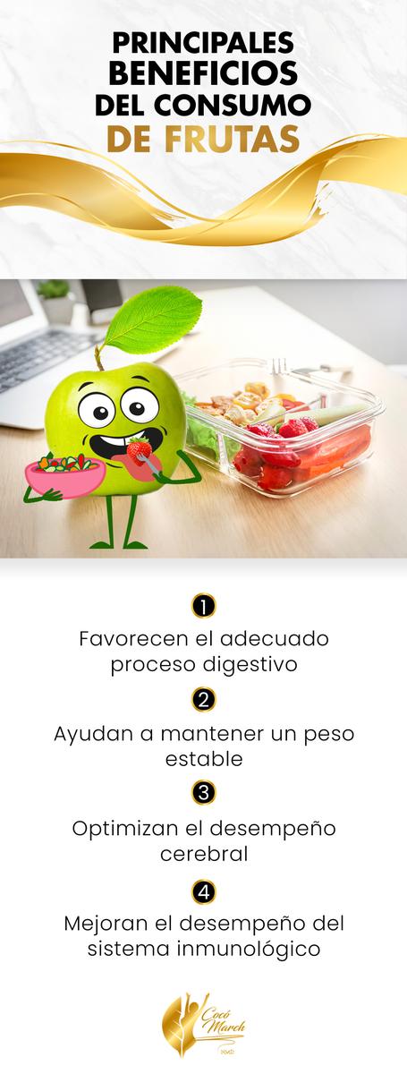 Favorecen el adecuado proceso digestivo: un factor importante que influye sobre este beneficio, es la alta cantidad de fibra dietética soluble presente en las frutas. De acuerdo a los estudiosos, esto se asocia con un adecuado nivel de motilidad intestinal y el control natural del estreñimiento.