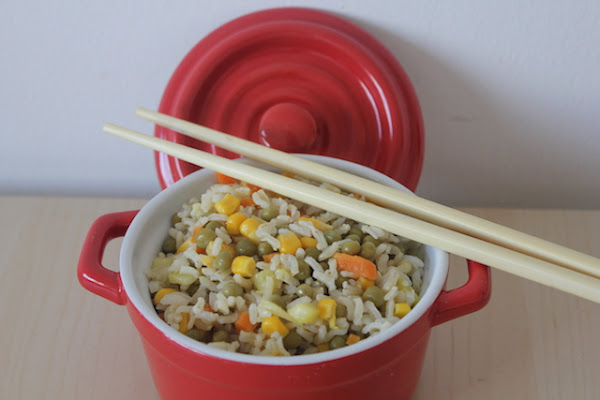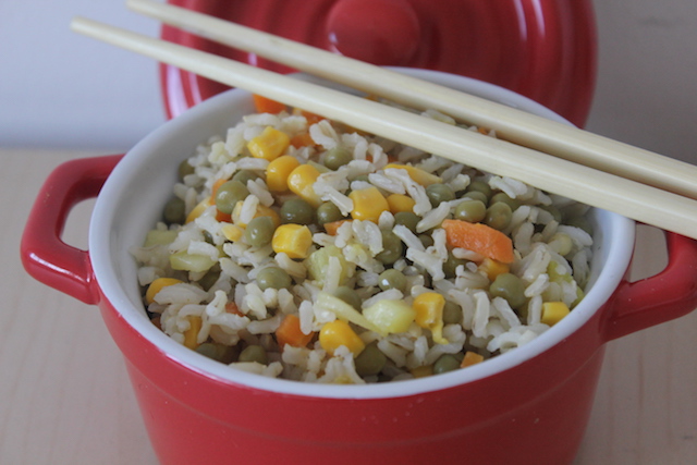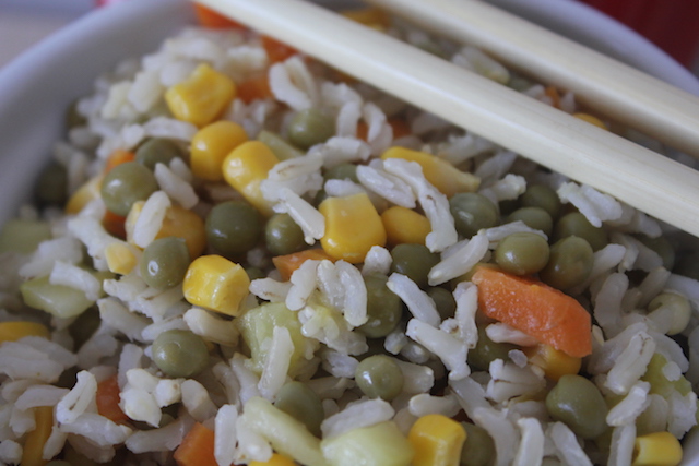 En una sartén añade el aceite de oliva. Seguidamente las zanahorias y el calabacín. Da un par de vueltas y añades los guisantes y el maíz dulce. Vuelve a mezclar y deja a fuego lento de 3 a 4 minutos.