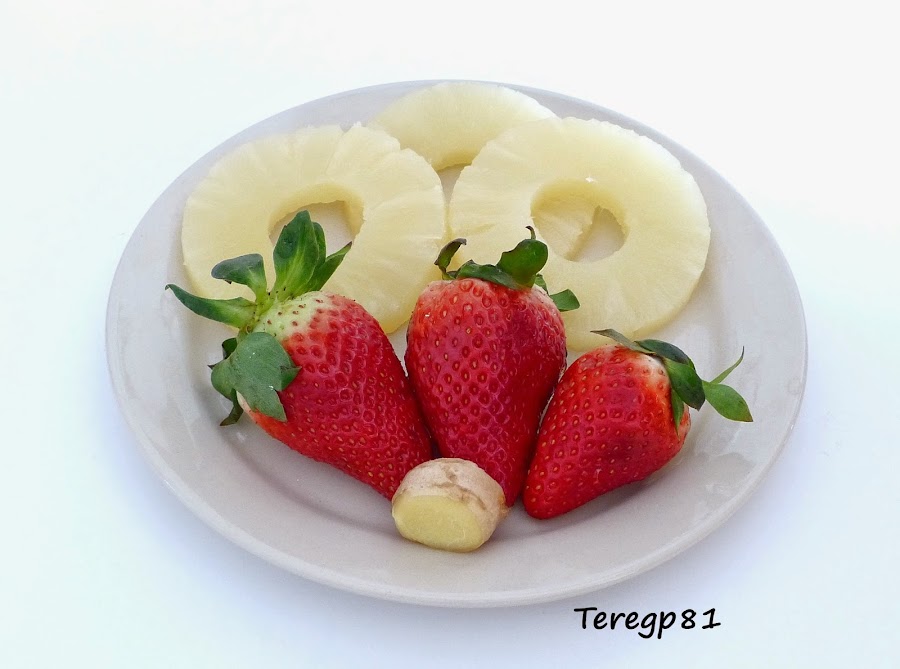 Ya os hablé de él en la anterior entrada, pero quiero que veáis la foto de los ingredientes: 3 rodajas de piña, 2 o 3 fresas (depende del tamaño), un tozo pequeño de jengibre y una cucharada grande de miel. Preparación: batimos todos los ingredientes, una vez listo podemos añadir una cucharada de chia.