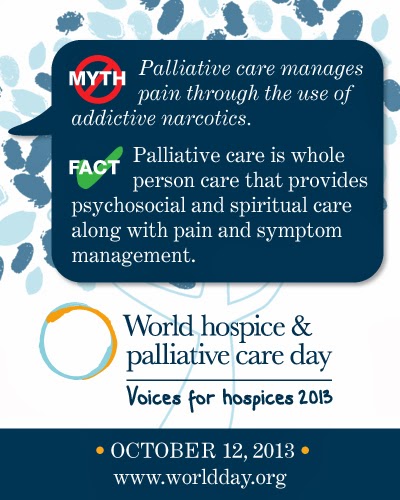 Cuando oímos 'cuidados paliativos' entendemos cosas que a veces distan mucho de la realidad que se pretende conseguir. Entre todos los profesionales de la salud debemos desmontar los mitos ( sobreentendiendo que son falsos) que existen a su alrededor. Esta empresa tan importante es el tema central de la celebración del Día Internacional de los Cuidados Paliativos para el 12 de octubre de 2014.