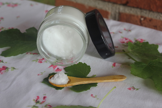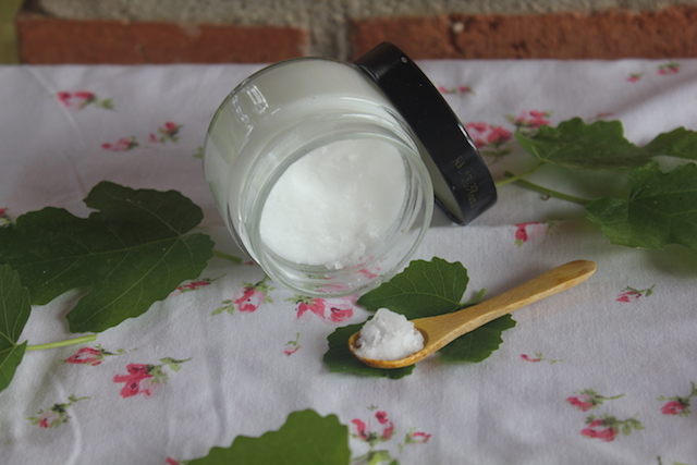 Pon en el tarro de cristal el aceite de coco, añade el bicarbonato y mézclalo bien, hasta que esté todo bien disuelto.