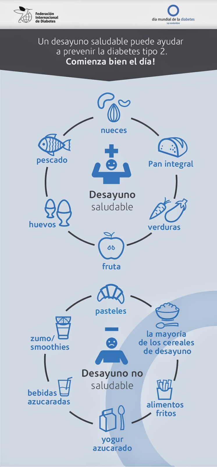 Aquí tenéis una comparación entre lo que debería y no debería contener un desayuno para un diabético:
