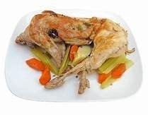 Se escaldan las cebollitas y pelarlas, se cortan las cabezas de ajo por la mitad y se doran en una sartén junto con al resto de los trozos de conejo.