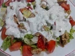 Elaborar la salsa poniendo en un cuenco el yogur, la albahaca, la escalonia picada, el perejil, los tomates cortados en trozos: salar, diluir con aceite, mezclar y verter la salsa sobre la ensalada.