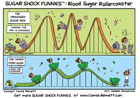 6. Para terminar, recordemos que el sirope de arce, como su nombre indica, está compuesto principalmente por azúcares (hidratos de carbono de absorción rápida). Según recomendaciones de expertos en salud, y como todos bien sabemos, éste tipo de hidratos de carbono no deberían superar el 15% de las calorías que aportan los hidratos de carbono a la dieta (lo que equivale a 50 gramos aproximadamente) por lo tanto, si nuestra dieta se compone única y exclusivamente de este producto, ¿estamos siguiendo dichas recomendaciones? ¿Qué supone esto para nuestra glucemia? Recordemos que los hidratos de carbono de absorción rápida producen picos de glucemia, pasamos de tener hiperglucemia a tener hipoglucemia, con las consecuencias que podemos ver gráficamente en la siguiente imagen.