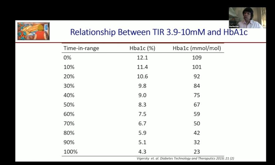 Esta sesión del Dr. Kar estuvo plagada de contenido interesante, pero teniendo que resumir os dejo algunos tips que me parecieron claves y uno de ellos, fue cómo en función del valor que tengas de TIR, puedes estimar el valor de hemoglobina glicosilada que tendrás, así como el margen de mejora. Os dejo un pantallazo de la presentación, pero ¿qué es lo que nos dice esta comparativa entre TIR y HbA1c? pues cuánto de bueno es nuestro control.