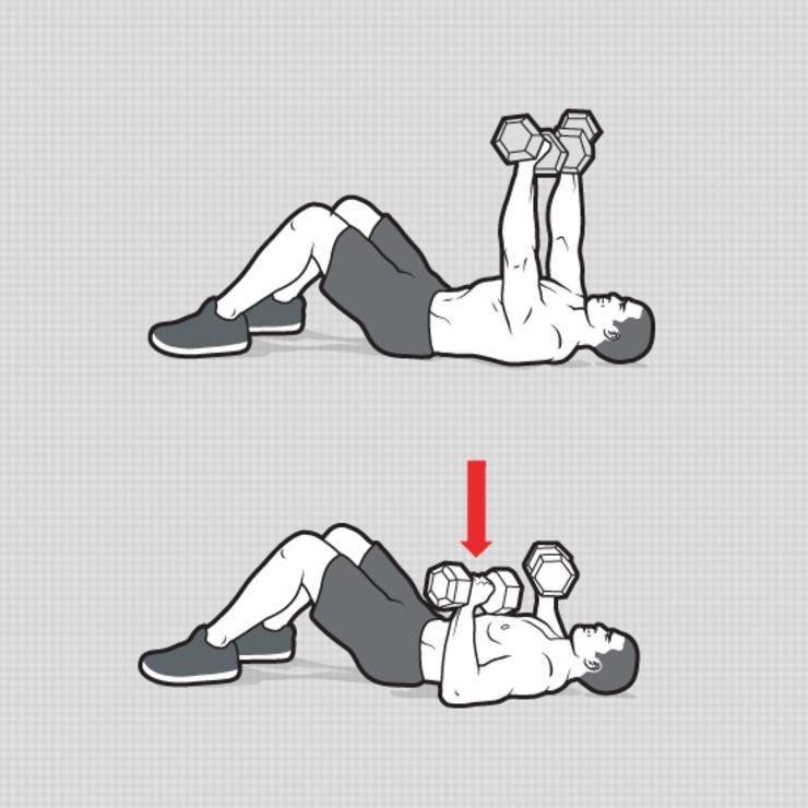 Nos colocaremos sobre una esterilla boca arriba mientras sostenemos en cada mano una mancuerna u objeto pesado que nos sirva a modo de pesa. Tendremos los brazos estirados hacia arriba y los flexionaremos hasta casi tocar el pecho. Desde esta posición inicial el ejercicio consistirá en la extensión y contracción de los tríceps.