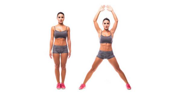 Deberemos colocarnos de pie con las piernas ligeramente abiertas. Desde aquí realizaremos un pequeño salto y mientras estamos en el aire juntaremos las manos por encima de nuestra cabeza y elevaremos ligeramente las piernas hacia los lados.