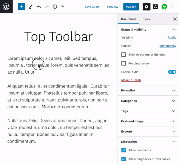 El editor de bloques tiene actualizaciones que traen algunas de tus características clásicas favoritas, como una pantalla de edición limpia. El editor de bloques muestra opciones flotantes y menús al mismo tiempo que escribes — estas te dan mucho control pero puede que no siempre las quieras visibles sobre tu contenido. Activa la barra de herramientas superior para mantenerla fija en la parte superior de la pantalla. Es una buena manera de ver la completa flexibilidad del editor de bloques mientras ofrece una escritura libre de distracciones.
