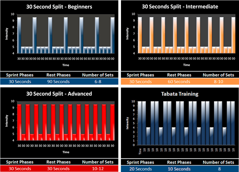 - Tenemos al método Tabata que establece 20 segundo de ejercicio en máxima intensidad por 10 segundos de reposo y repetirlo 8 veces.