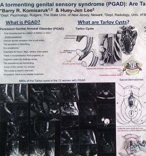 Desde Sildanblog y ahondando un poco más sobre el tema, podemos decirte que tal vez este problema, hasta ahora casi exlusivo de las mujeres dentro de su carácter de extremadamente raro, puede que tenga algunos visos de poder tener una solución. El científico Barry Komisaruk, en su laboratorio de la Rutgers University ha comprobado hace unos meses que una mujer que padecía este síndrome tenía unos quistes benignos, llamados de Tarlov, en la zona sacra de la espina dorsal, justo en el inicio del nervio pudendo, que es el que recibe la sensibilidad de los genitales. El científico pensó que "tal vez estos quistes pudieran estar pinzando o aplastando el nervio pudendo y provocar una hiperactividad del mismo de modo y manera que estuviera enviando información constante al cerebro". Poco después, Komisaruk contactó con una asociación de afectadas por este síndrome, pidiéndoles que aquellas que así lo decidiesen le enviaran una resonancia magnética de la zona citada. Pues bien, 18 de ellas lo hicieron, y para su sorpresa, 12 de ellas tenían entre 1 y 3 de estos quistes. Evidentemente queda por explicar por qué las otras 6 voluntarias experimentan este síndrome, pero al menos, se ha abierto una vía de investigación. La hipótesis de Komisaruk fue publicada recientemente en la revista científica Journal of Sexual Medicine.