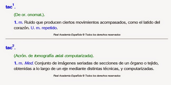 Otro caso totalmente distinto es el del T.A.C. y es por el que escribo este post. El otro día... Alba, gran médica, mejor amiga y además de las dos cosas, muy perfeccionista... (nos parecemos en lo último ;)) me comentó que lo correcto era decir la TAC, ya que TAC era una abreviatura de tomografía axial computarizada y como la palabra tomografía es femenina...