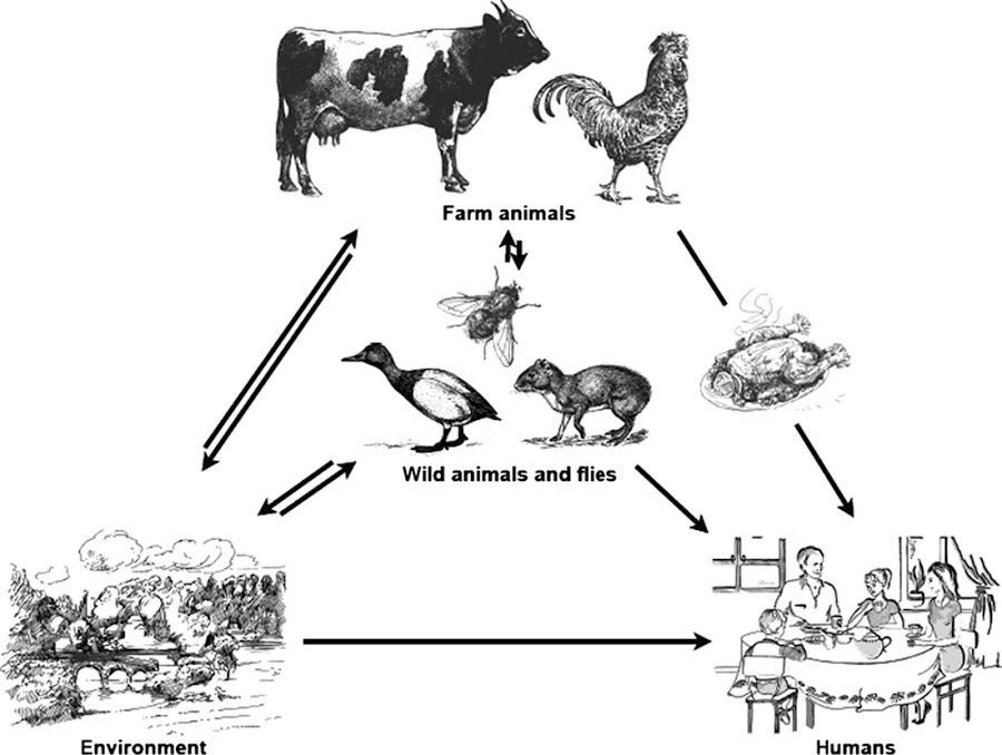 La transmisión de la infección se puede efectuar de forma directa, por contacto con animales domésticos enfermos, como cachorros de perro y gato con diarrea; o indirecta, más frecuente y tiene lugar por la ingestión de alimentos de origen animal (carne, leche…) oagua contaminados. Cuando la enfermedad es consecuencia de la ingestión de leche o agua contaminados, suele aparecer en forma de brotes; la infección por otros alimentos de origen animal contaminados, por ejemplo, carne de pollo, tiende a ser esporádica y se suele producir por una contaminación cruzada originada durante la preparación y cocinado del alimento.