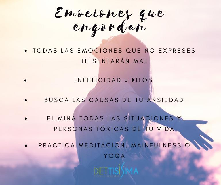 Resumen: SIEMPRE QUE TENGAS QUE “TRAGARTE” TUS EMOCIONES TE SENTARÁN MAL. Y si tu tendencia es coger kilos, con certeza cogerás. Todo lo que te genere preocupación, frustración o que no lo puedas expresar, te va a perjudicar. LA EMOCIÓN QUE MÁS ADELGAZA ES LA FELICIDAD.