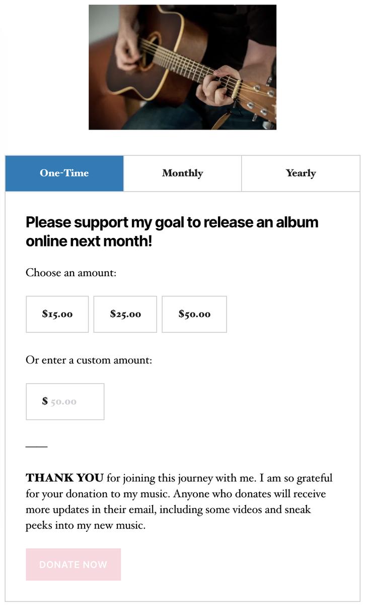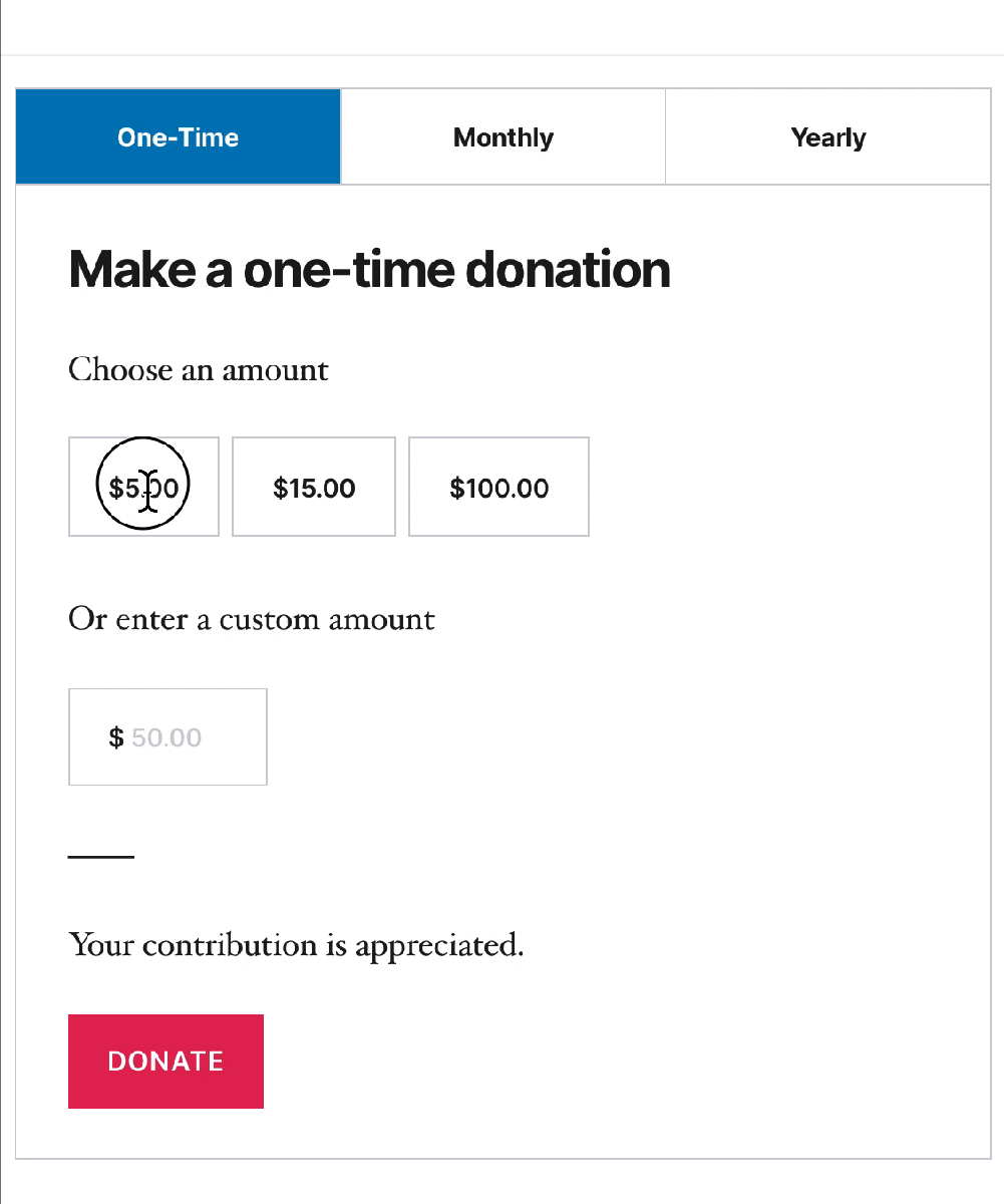 También puedes dejar que tus visitantes elijan la cantidad que quieren donar —básicamente un espacio en blanco que pueden rellenar con la cantidad que elijan.