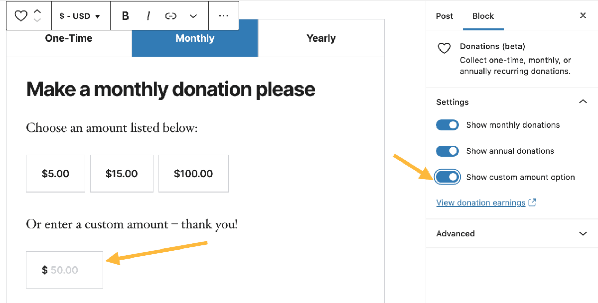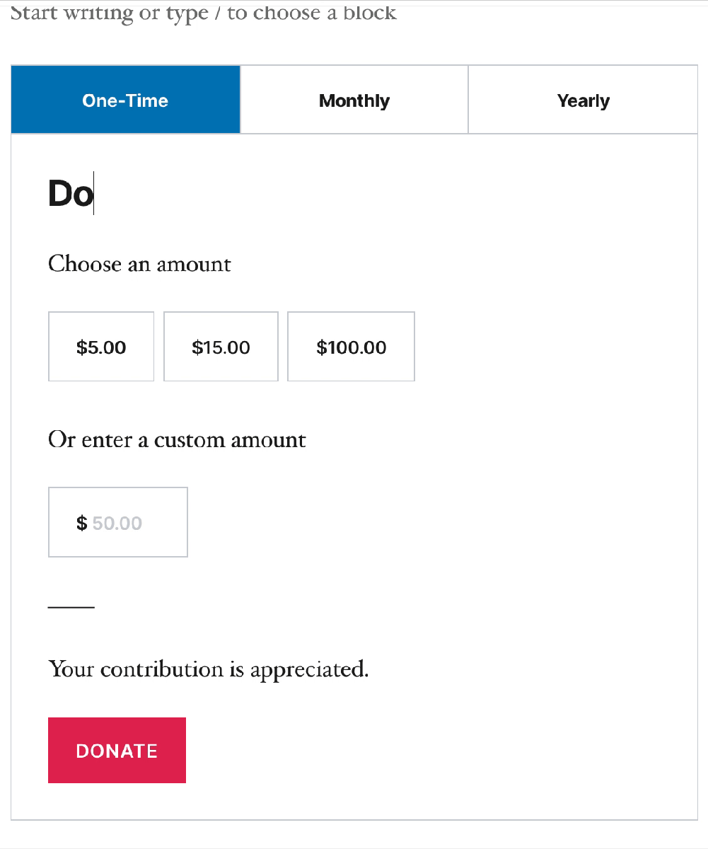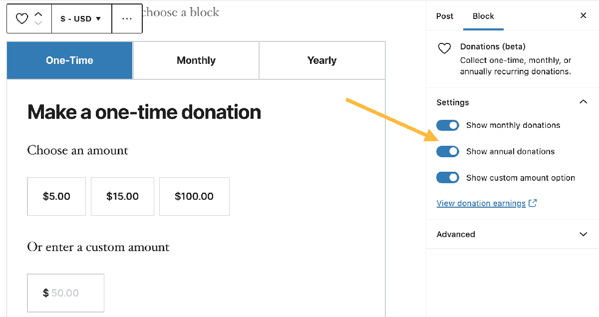 Cuando ya hayas conectado tu cuenta de Stripe, configura las opciones del bloque; como, por ejemplo, si pedir donaciones únicas, mensuales o anuales.