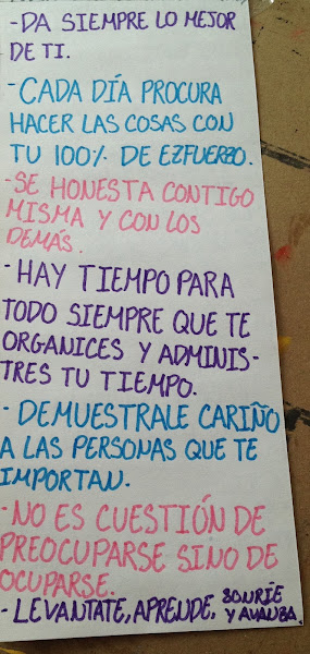 Para enero con el inicio de un nuevo año y un nuevo trimestre realicé una lista de metas para el año (algo que no había hecho ante por lo que en algunas metas no fui del todo realista). Me dije que sería un año de cambios para mi, en mi actitud ante la vida más que nada, por lo que decidí darle un voto de confianza a mi manera de proceder y a que era capaz de realizar cualquier cosa que en verdad me propusiese siempre que fuera constante y dejara de pesar más de lo que actuaba (aún sigo trabajando en eso pero he de decirles que he vistos cambios). Incluso llegué a realizar unas listas de "mandamientos" con frases para mi misma que me ayudaron y me siguen ayudando a mantenerme motivada. También me dispuse a ordenar mi habitación de la residencia, de un modo que me hiciera sentir que ese lugar era mi espacio, lo cuál me brindo algo más de seguridad en mi y sirvió para recordarme constantemente lo que era capaz de hacer, por lo que aquí les dejo el tercer tip: