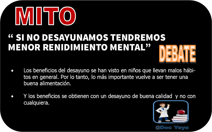 - Podemos ver esta revisión concluyendo que no hay evidencia para declarar que la falta de desayuno afecta el desempeño mental, pero si hay un beneficio si es una desayuno completo y nutritivo : The effect of breakfast composition and energy contribution on cognitive and academic performance: a systematic review. http://goo.gl/nRvAX4