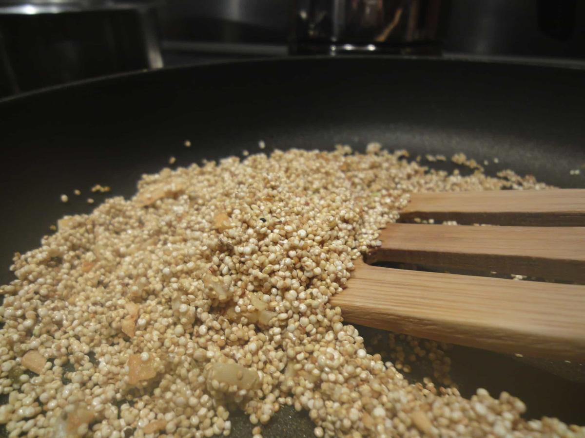 En una sartén ponemos un poco de aceite de coco (o de oliva), salteamos a fuego bajo un ajo con 1/2 cucharadita de tomillo, una vez se empiecen a dorar los ajos agregamos la quinoa y la tostamos. De esta manera nos quedará más aromatizada y facilitaremos su digestión.