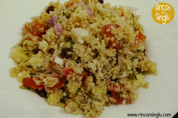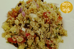 Se trata de una receta de ensalada de sémola de trigo, donde nosotros hemos cambiado la sémola de trigo por quinoa (que también la podéis versionar con sémola de maíz, para hacerla apta para una dieta sin gluten).