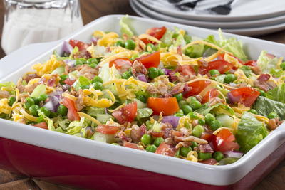 En una fuente de vidrio para hornear ponga la mitad de la lechuga, el pimiento rojo, el apio, los tomates, los guisantes, la cebolla, el queso, el tocino y el aderezo. Repetir capas una vez más. Servir o refrigerar hasta que esté listo para servir.