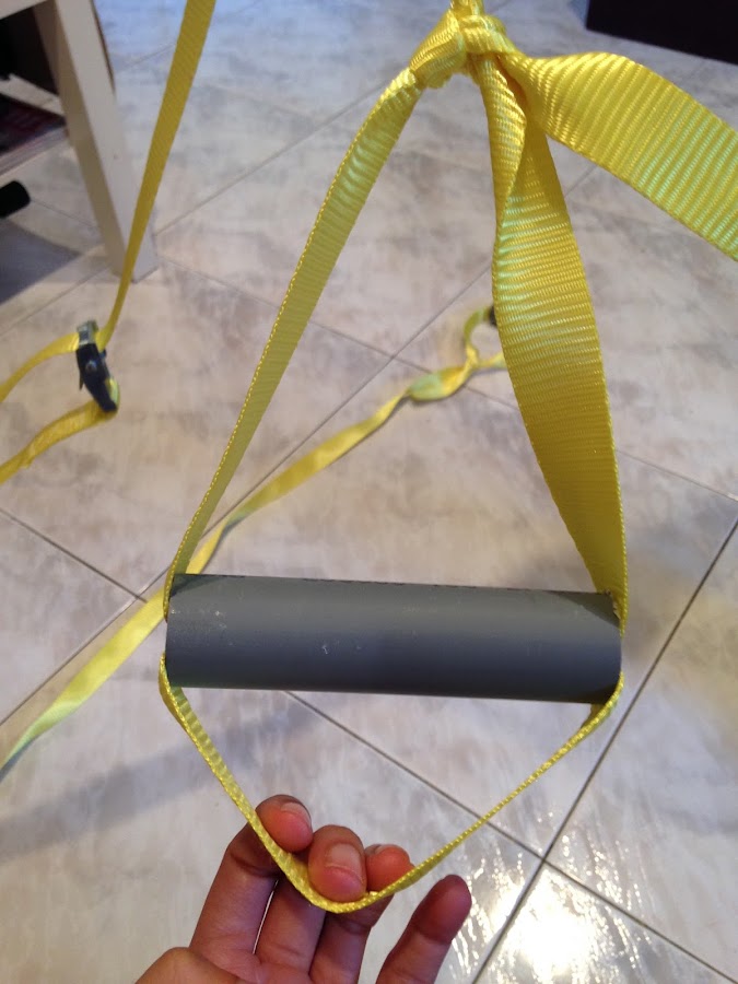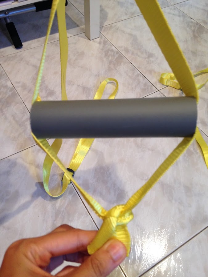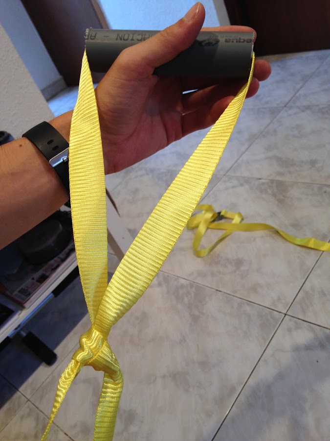 Pasamos la cuerda por dentro del tubo y haremos un doble nudo normal, hacerlo! ¿Veis el resultado? Los amarres para los pies de nuestro TRX!