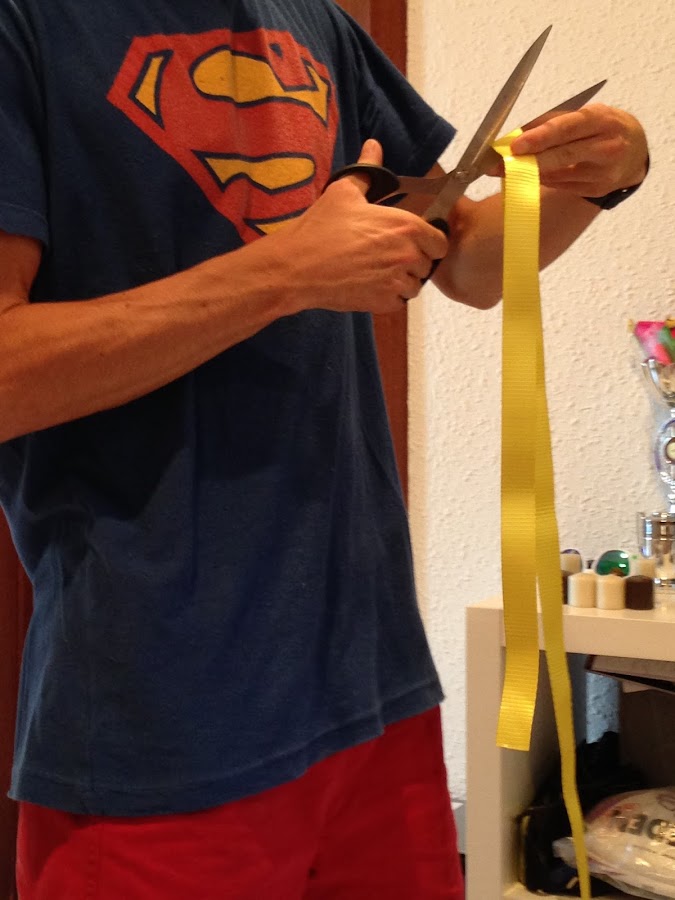 Con todo el material encima de la mesa, procedemos a cortar los dos trinquetes de amarre a la medida de 2,50 cm, cerciórate de que los dos trinquetes estén totalmente bien estirados y rectos (en el suelo) y que los cortas a la misma medida.
