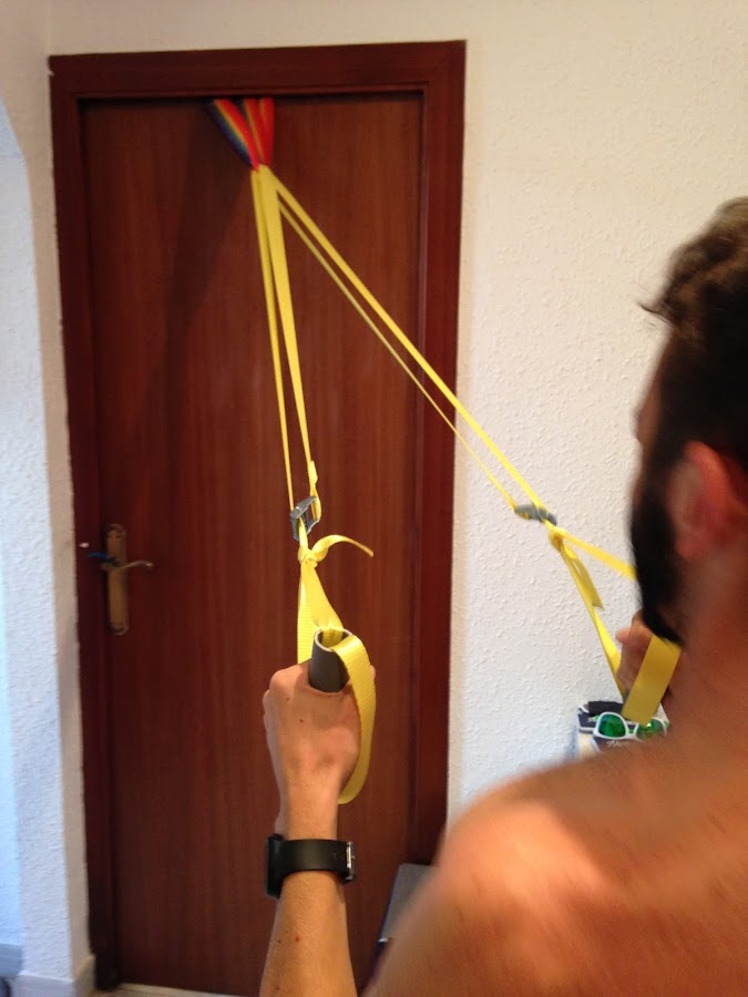 Para utilizarlo nuestro TRX casero es tan fácil como pasar la cuerda por la parte superior de la puerta, asegurándonos que el "click" está cerca de la puerta para que al cerrarla, haga de tope!