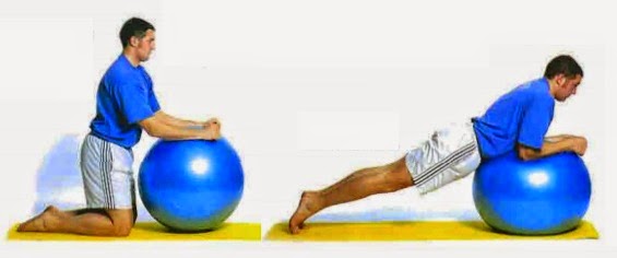 Este ejercicio sirve para fortalecer la columna, trabajando los músculos centrales y los de la espalda. Arrodíllate con la pelota delante, coloca los antebrazos en la pelota y asegúrate de que la columna está en posición neutra. Contrae los músculos abdominales inferiores y lentamente empuja con los pies dejando que la pelota avance hasta colocarse debajo del cuerpo manteniendo los brazos flexionados desde los codos. Mantén el control de la pelota y la columna alineada. Aguanta 5 segundos y vuelve a la posición original.