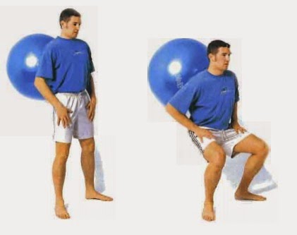 Las sentadillas sirven para fortalecer los músculos de los cuádriceps (parte delantera del muslo). Combinando las sentadillas con el fitball añadimos el componente de control de un objeto en movimiento.