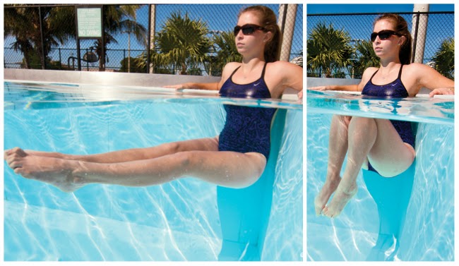 Colocándonos de espaldas en el borde de la piscina apoyando codos en los bordes como si estuviéramos sentados con el cuerpo semi sumergido flexionamos las rodillas y extendemos las piernas como en la foto.