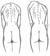 Se puede sospechar de una escoliosis cuando observamos en el niño un hombro más alto que otro o un desnivel en la pelvis, que puede encontrarse rotada o no. Un signo inequívoco de que existe una escoliosis es la aparición de una prominencia en la zona dorsal cuando el sujeto flexiona la columna hacia delante, como se observa en la imagen de la derecha: