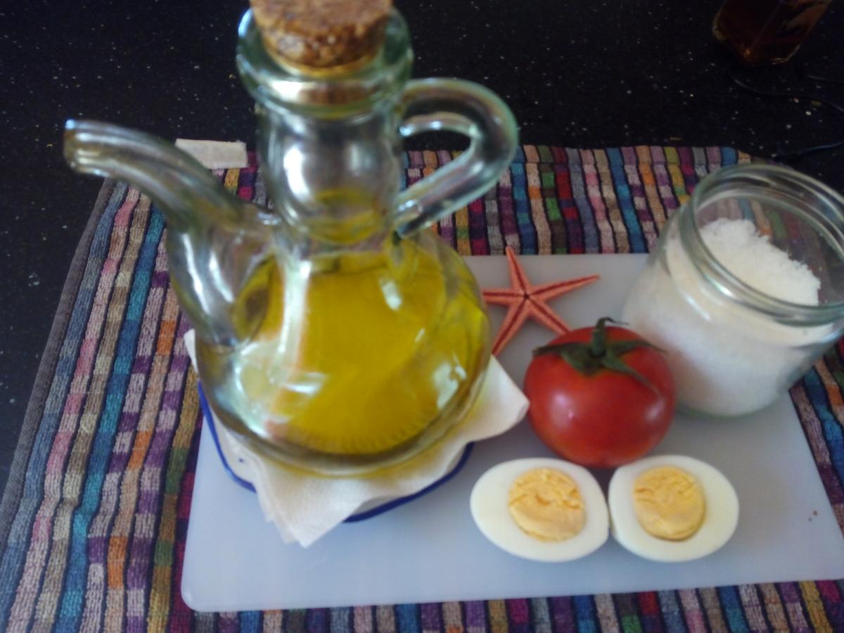 Preparamos el aliño triturando el huevo duro junto con el tomate, el vinagre, el aceite y sal al gusto. si prefieres el aliño con tropezones puedes cortar a cuadraditos pequeños el huevo duro y el tomate y luego lo acabas de aliñar con el vinagre, el aceite y la sal.
