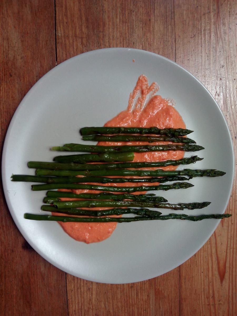 Para montar el plato vertemos el aliño en el plato y luego colocamos los espárragos encima.